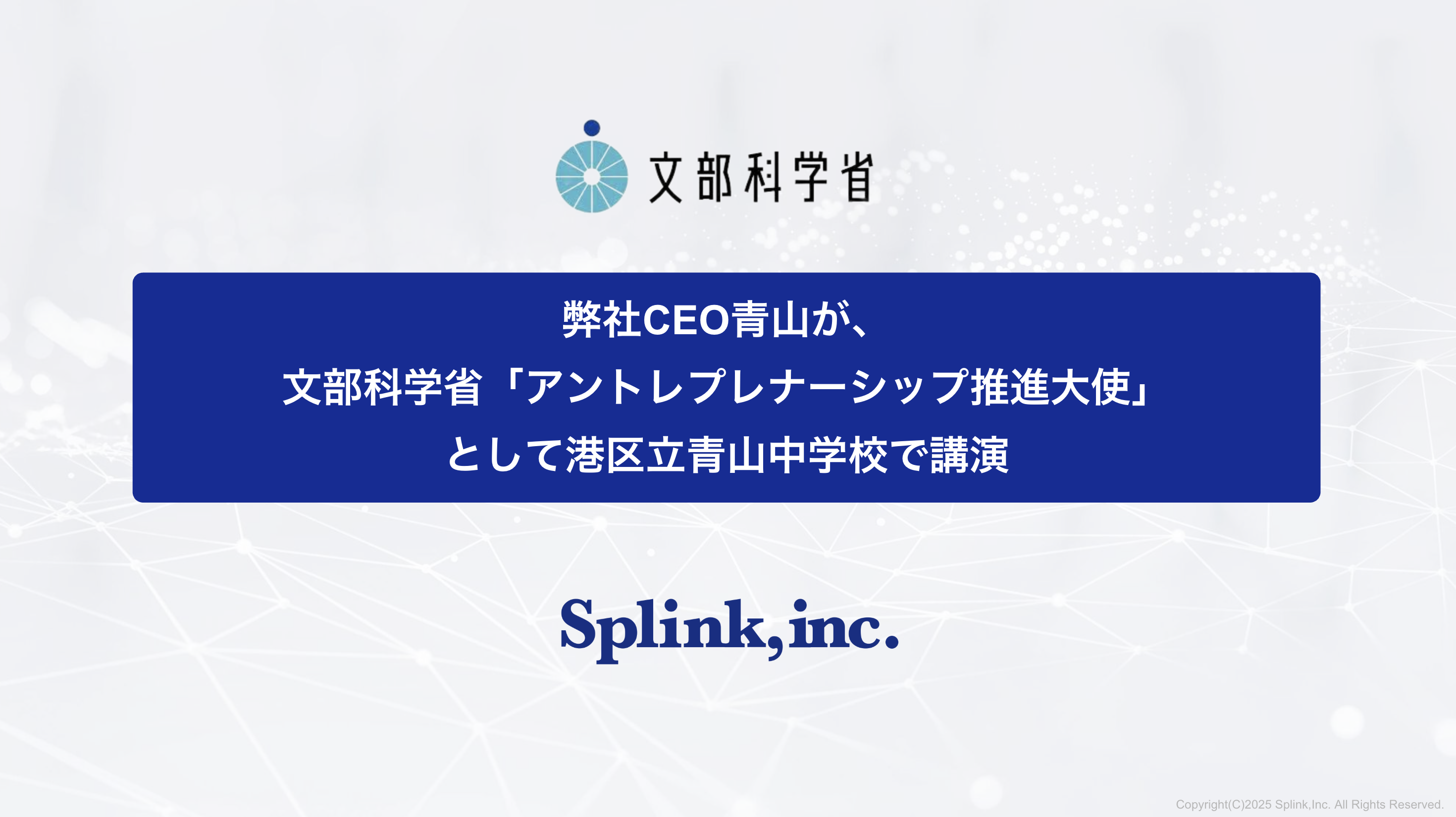 株式会社Splinkの代表取締役CEO 青山裕紀が、文部科学省「アントレプレナーシップ推進大使」として、2025年9月5日に港区立青山中学校にて講演を行いました。