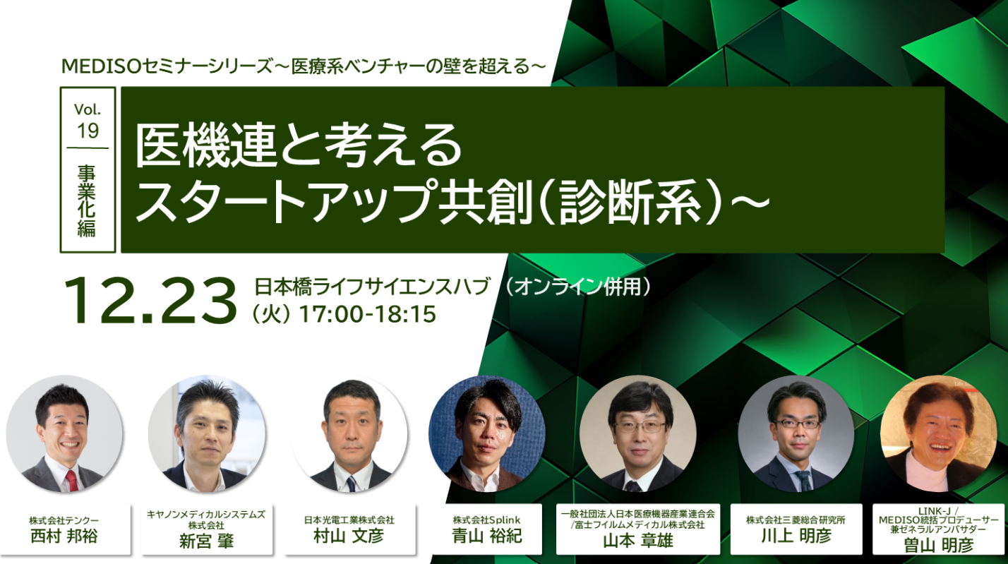 本セミナーは、2回シリーズの完結編として開催され、治療から診断までを通じた「スタートアップと既存企業の共創」による医療イノベーションの可能性がより一層深掘りされる機会となりました。